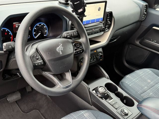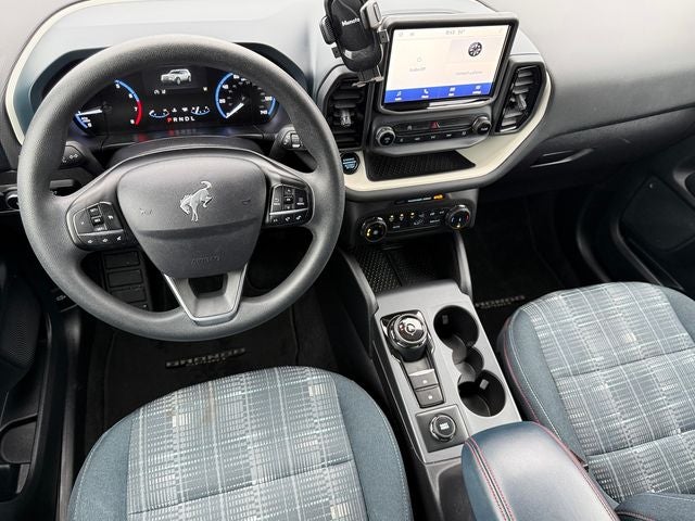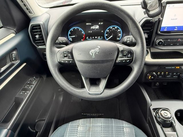 Ford Gold Certified Certified, 3.80 Axle Ratio, 4-Wheel Disc Brakes, 6 Speakers, ABS brakes, Air Conditioning, Alloy wheels, AM/FM radio: SiriusXM, AM/FM Stereo, Auto High-beam Headlights, Automatic temperature control, Brake assist, Cargo Mat, Compass, Delay-off headlights, Driver door bin, Driver vanity mirror, Dual front impact airbags, Dual front side impact airbags, Electronic Stability Control, Emergency communication system: SYNC 3 911 Assist, Equipment Group 250A, Four wheel independent suspension, Front anti-roll bar, Front Bucket Seats, Front Center Armrest, Front fog lights, Front License Plate Bracket, Front reading lights, Fully automatic headlights, Heated door mirrors, Illuminated entry, Knee airbag, Low tire pressure warning, Occupant sensing airbag, Outside temperature display, Overhead airbag, Overhead console, Panic alarm, Passenger door bin, Passenger vanity mirror, Plaid Cloth Front Bucket Seats, Power door mirrors, Power steering, Power windows, Radio data system, Rear anti-roll bar, Rear reading lights, Rear seat center armrest, Rear window defroster, Rear window wiper, Remote keyless entry, Security system, SiriusXM, Speed control, Speed-sensing steering, Speed-Sensitive Wipers, Split folding rear seat, Steering wheel mounted audio controls, SYNC 3 Communications & Entertainment System, SYNC 3/Apple CarPlay/Android Auto, Tachometer, Telescoping steering wheel, Tilt steering wheel, Traction control, Trip computer, Variably intermittent wipers, Wheels: 17 Oxford White-Painted Aluminum. Blue Metallic 2023 Ford Bronco Sport Heritage 4WD 8-Speed Automatic 1.5L EcoBoost